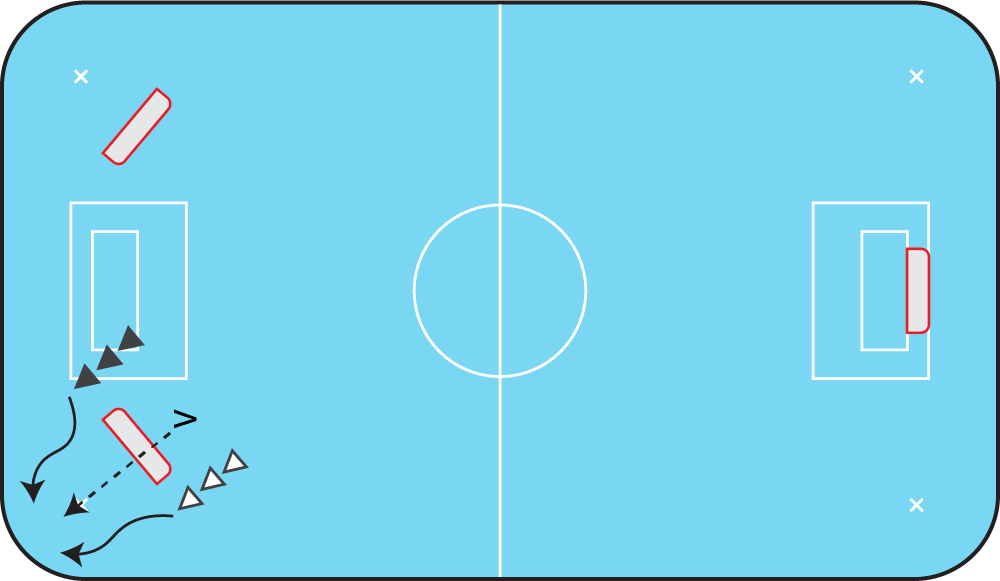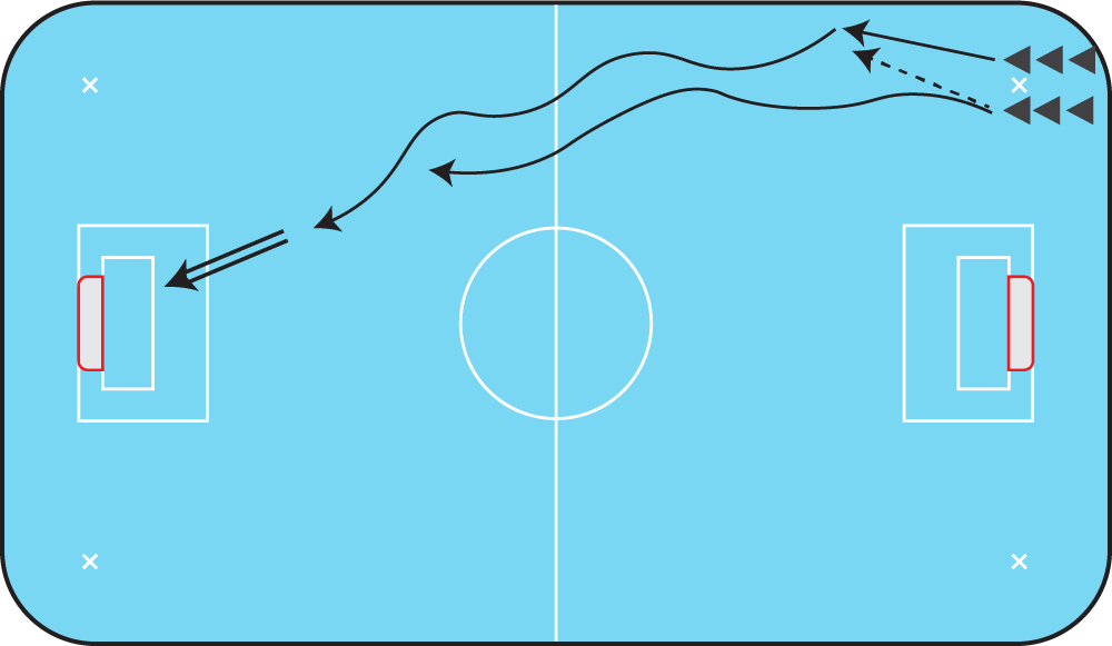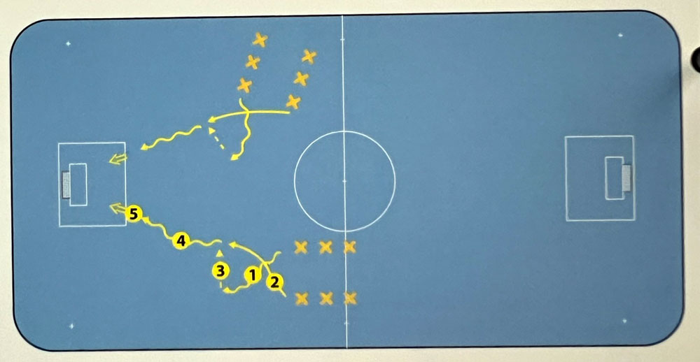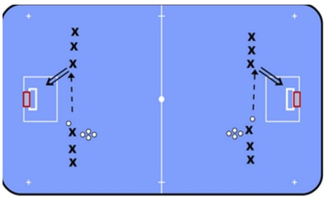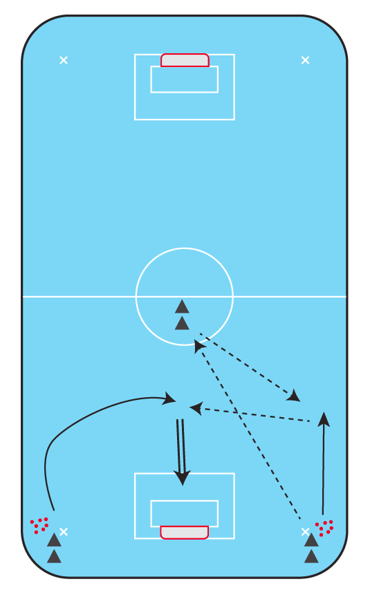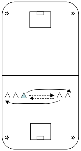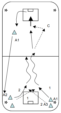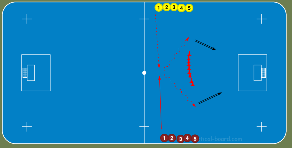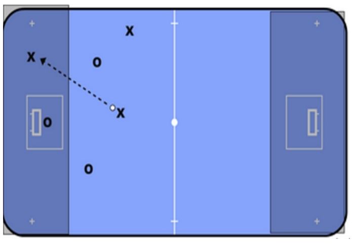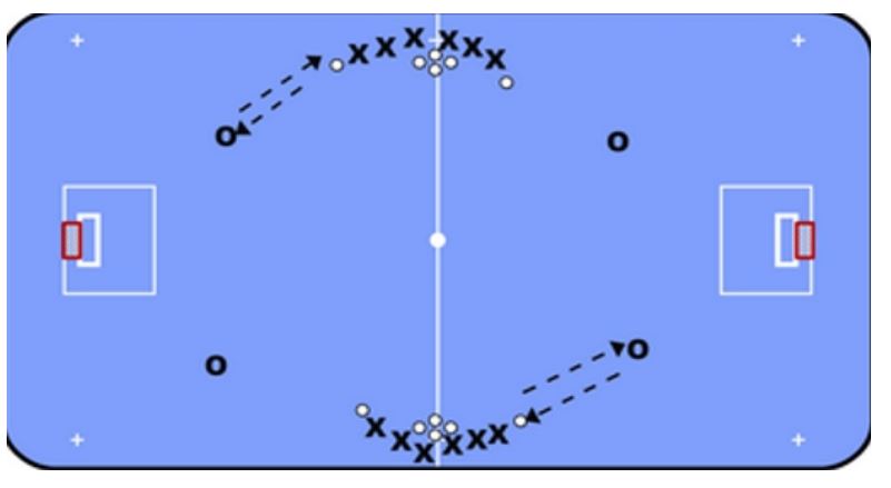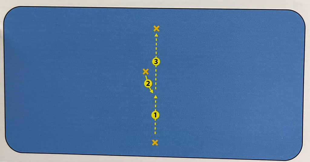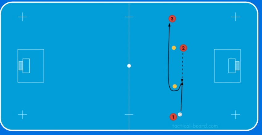 Liikkeelle voidaan lähteä esim. kolmesta metristä. Toinen laitapelaaja syöttää pallon keskipelaajalle. Keskipelaaja lähtee palloa vastaan, saa syötön, kääntyy vastakkaisen puolen pelaajaa kohti ja syöttää pallon hänelle.