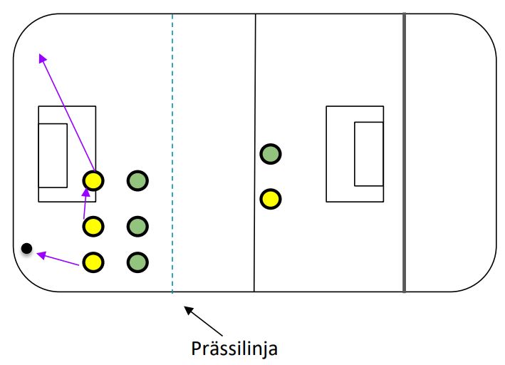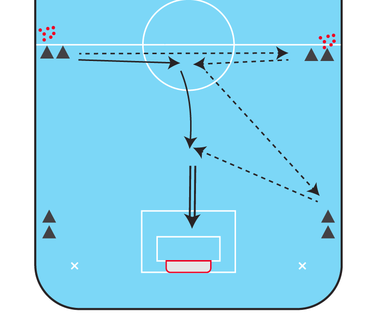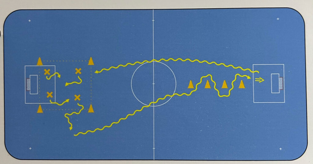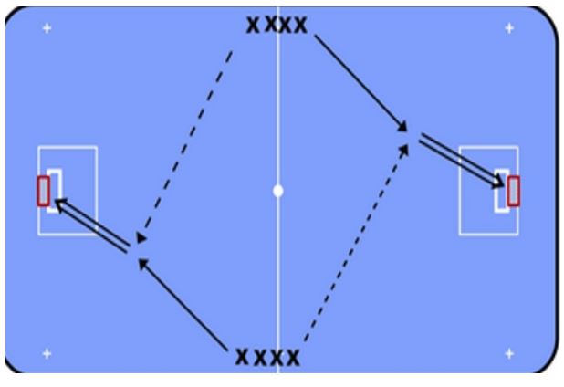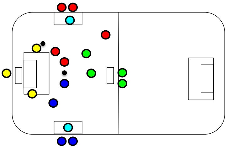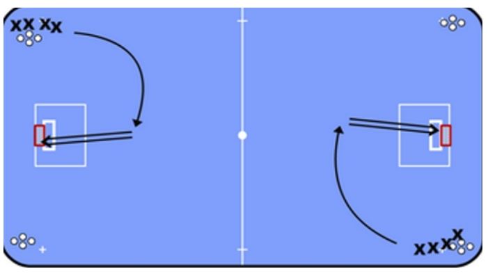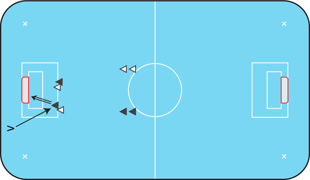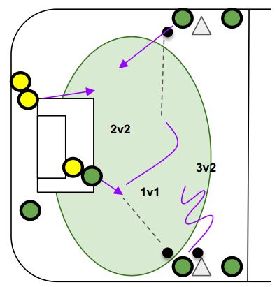 2 vastaan 2 peli alueen sisällä. Linjajokerit ovat käytettävissä hyökkäystiimiin. 40–50 sekunnin vuoroja. Valmentaja syöttää pallon peliin.