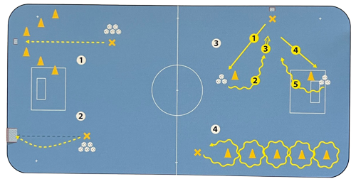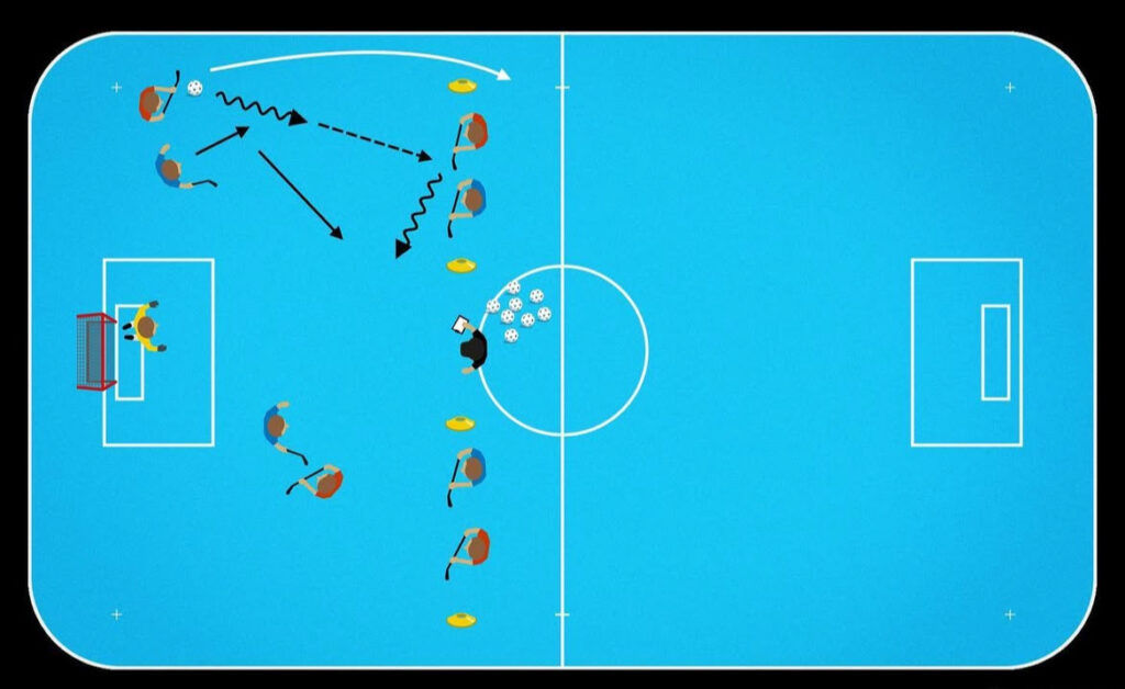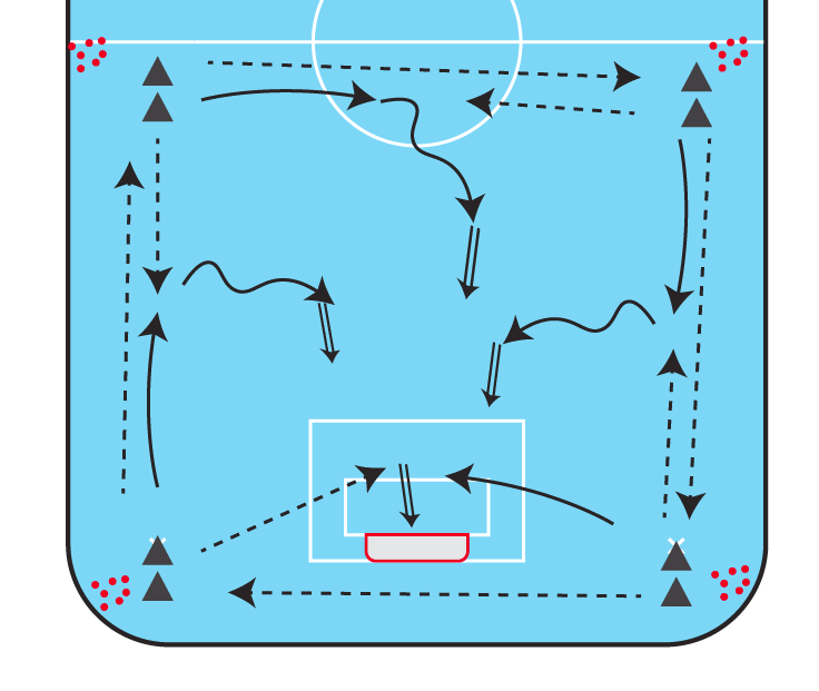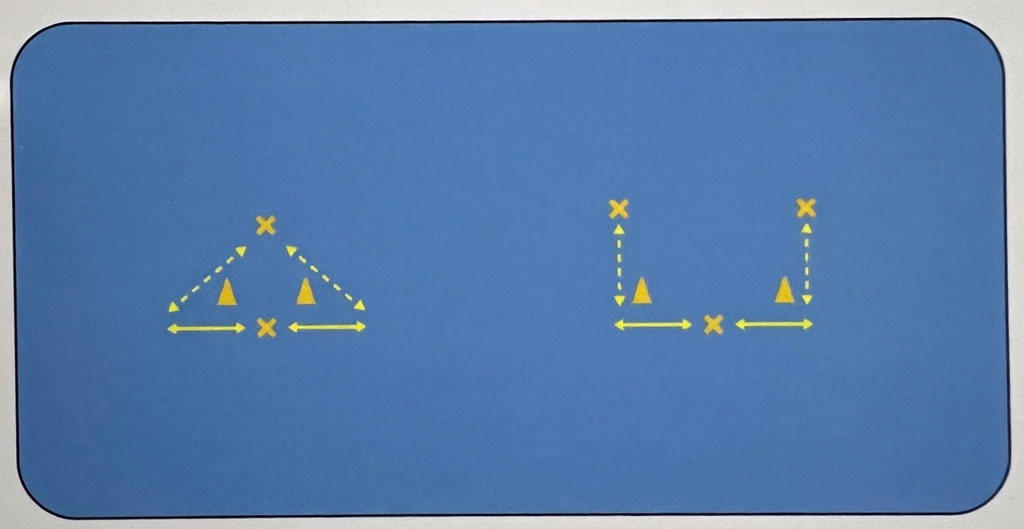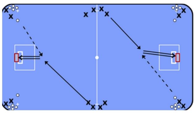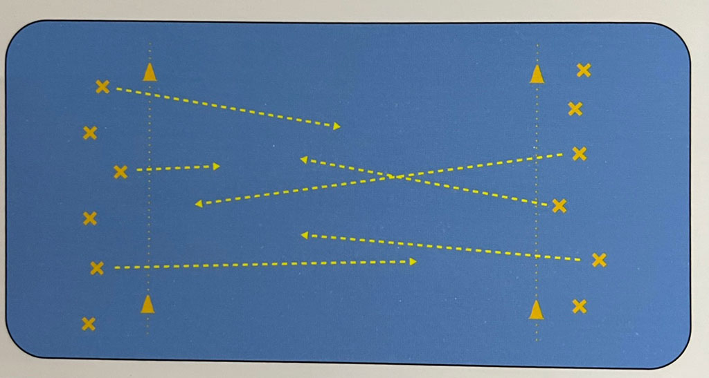 Harjoitus tehdään kolmen pelaajan ryhmässä, kahdella syöttäjällä. Molemmat syöttäjät seisovat parin metrin päässä oman kartionsa takana. He antavat vuorotellen syötön sivuaskelilla liikkuvalle pelaajalle. Syöttö annetaan oman kartion ulkopuolelle.