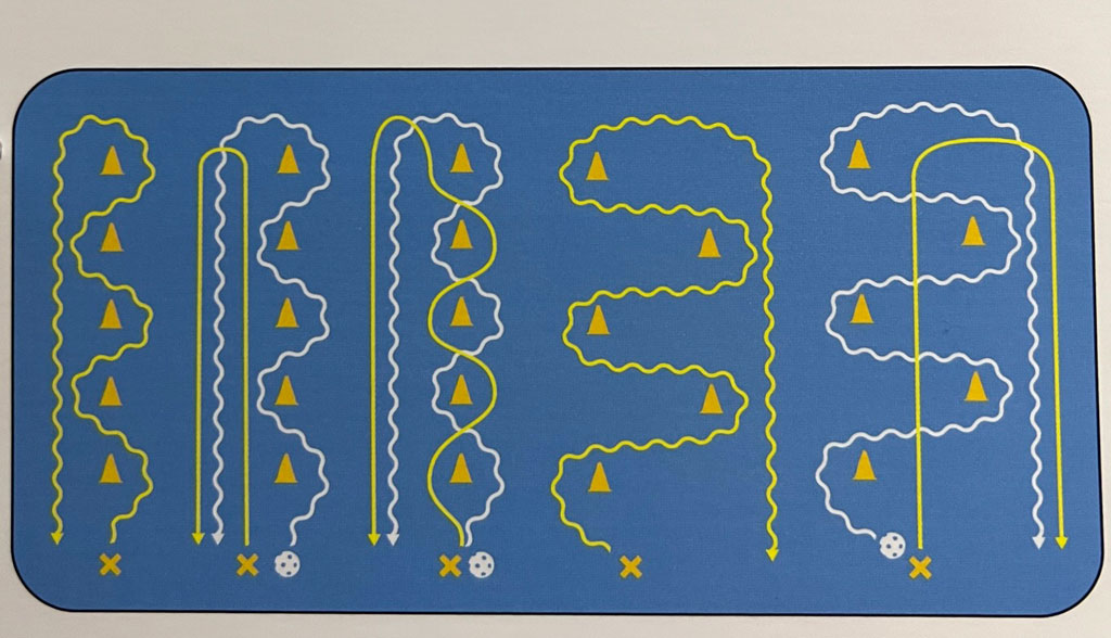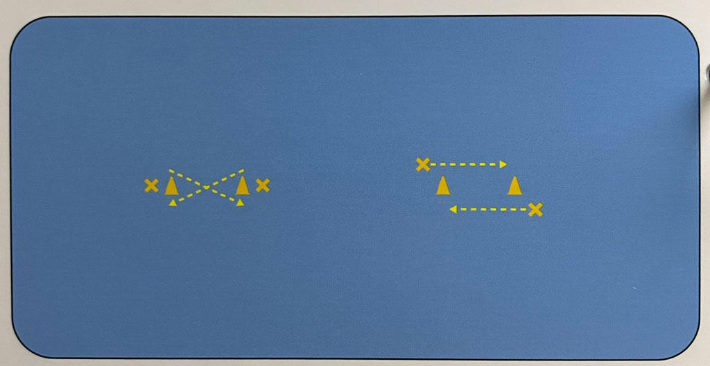 Kuten edellä, mutta kartiot asetetaan kahteen rinnakkaiseen jonoon ns. siksak-muodostelmaan, 1-2 metrin päähän toisistaan.