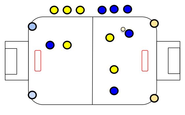 Pelaajat muodostavat kolmen ryhmiä. Ryhmä asettuu riviin; kaksi pelaajaa laidoille ja yksi keskelle. Keskipelaajan etäisyys laitapelaajista säädetään pelaajien taitotason mukaan.
