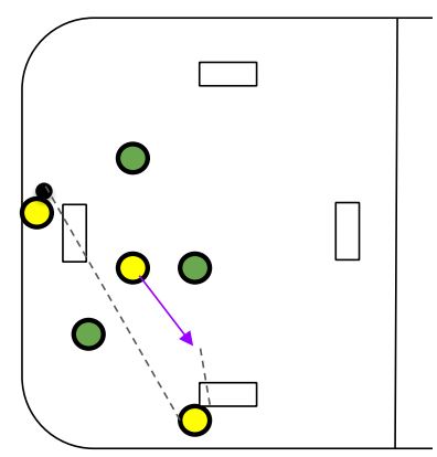 4. P3 syöttää pallon takaisin P2:selle joka kääntyy toisen keilan ympäri ja antaa syötön kantilta P1:selle.