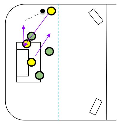 2. P2 pyörähtää 180 astetta keilan kohdalla ja syöttöä pallon P3:selle.
